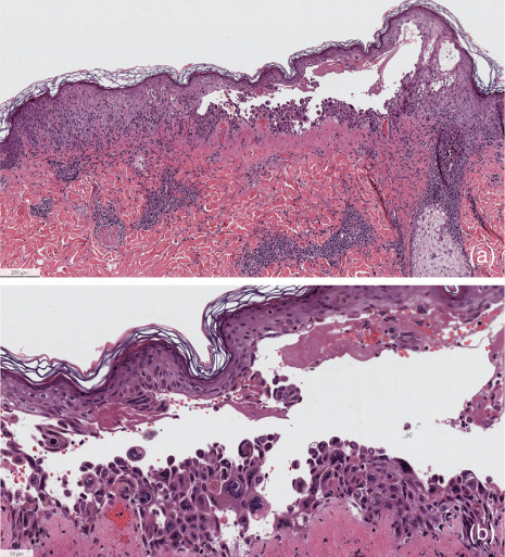 图2 皮肤活检染色结果(a:低倍视图显示棘皮和表皮内小泡形成;b:高倍视图显示多核棘皮松解性角质形成细胞和具有钢灰色核的角质形成细胞)