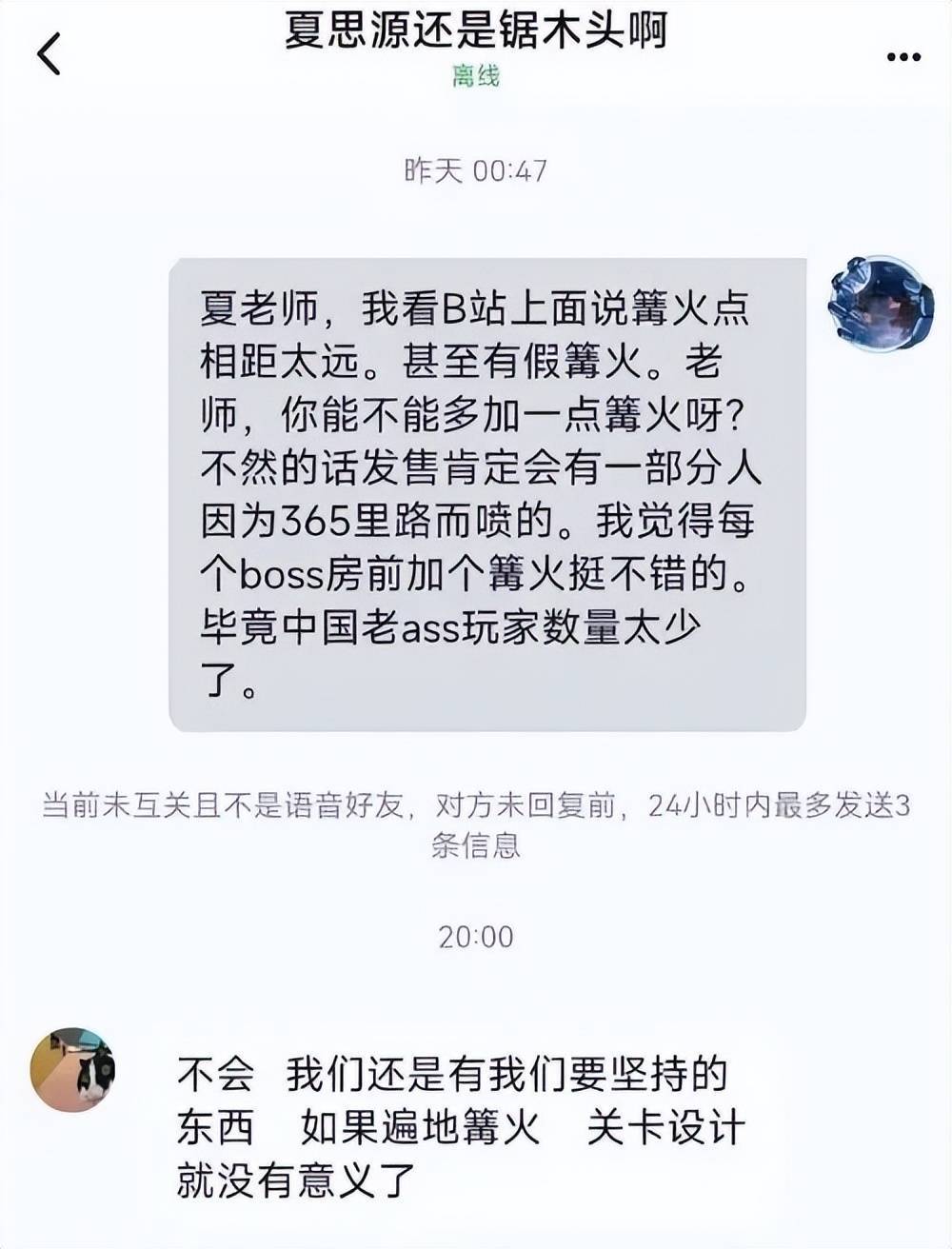 此前夏思源在社交网络上没少回复玩家的评论和私信,这种“没架子”的姿态让不少玩家颇为认同,认为透明直接的沟通方式,能让大家清晰认识到游戏的特色所在。