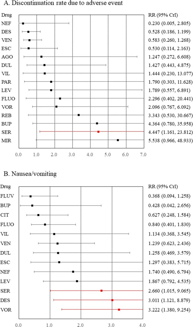去甲文拉法辛、帕罗西汀、舍曲林、文拉法辛和沃替西汀的全因停药率低于安慰剂(图1)。RR值介于0.523(帕罗西汀)到0.768(沃替西汀)之间。去甲文拉法辛、帕罗西汀和文拉法辛还优于左旋米那普仑和维拉唑酮;舍曲林也优于左旋米那普仑。