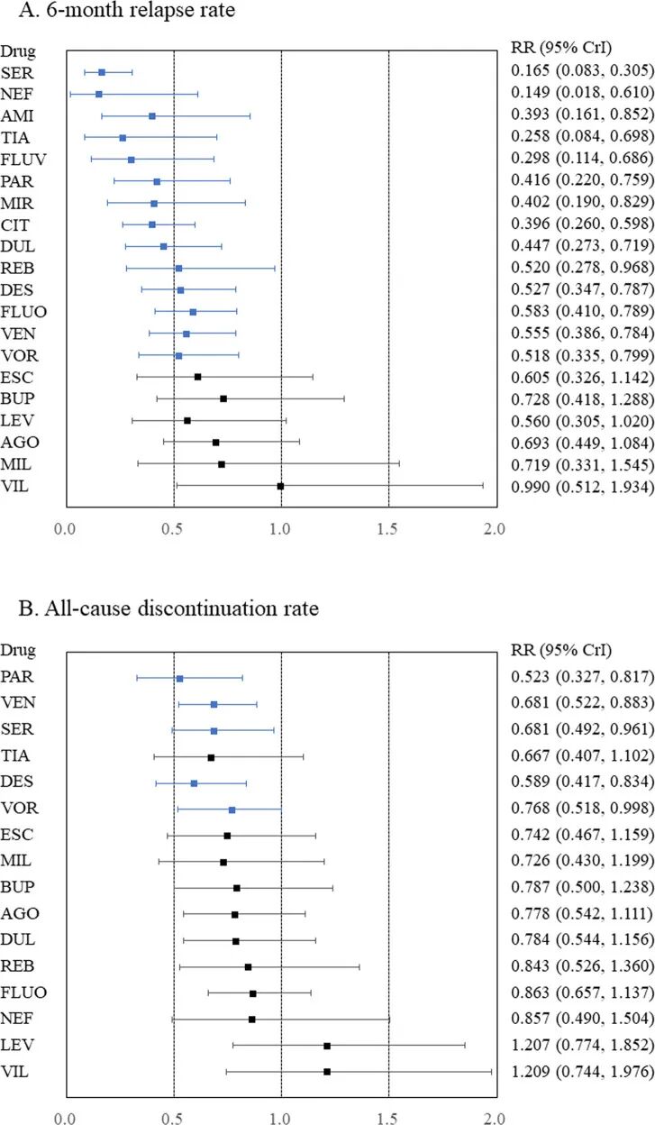 研究检索了 PubMed、Cochrane Library 和 Embase ,仅纳入采用富集设计的双盲、随机、安慰剂对照试验:即在开放标签研究期间,患者先使用目标抗抑郁药达到病情稳定,随后被随机分组,继续使用原药物或改用安慰剂。主要结局指标为6个月复发率(疗效指标),次要结局包括全因停药率(可接受性)、因不良事件停药率(耐受性)以及各项不良事件的发生率。